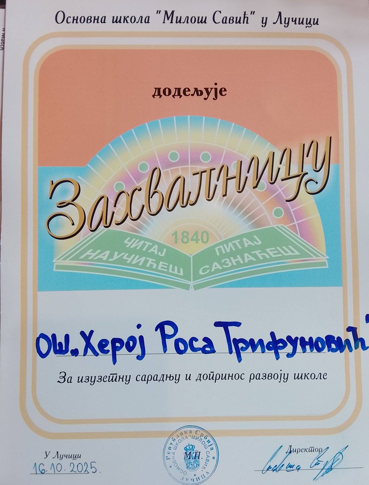 Поводом Дана Општине Жабари, Октобарска награда као највише признање за изузетан допринос у развоју и афирмацији општине Жабари у 2025. години додељена је Славици Којић, директорки наше школе ОШ „Херој Роса Трифуновић“.
