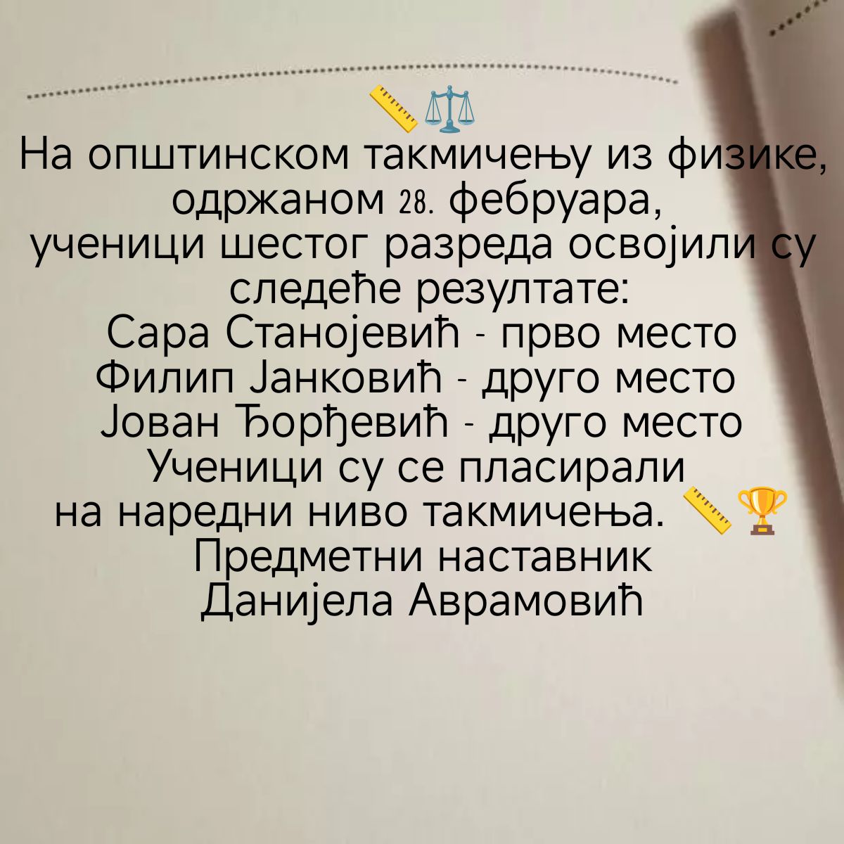Честитамо ученицима и менторима: Ивани Даниловић, Весни Лазаревић и Данијели Стојадиновић