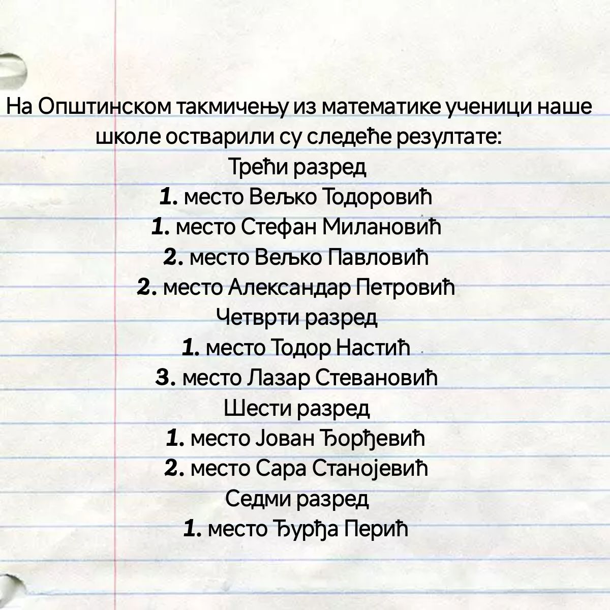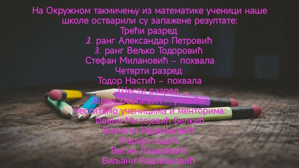 Сви поменути ученици остварили су пласман на Окружно такмичење. Све честитке ученицима и наставницима Александру Димитријевићу и Сузани Милошевић Ракић.